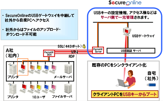 本サービスは、日立ソフトが必要なときに必要なだけIT環境を提供する「SecureOnline(セキュアオンライン)統制IT基盤提供サービス(※4)」をご利用いただくことにより、お客様は新たな設備投資を必要とせず、シンクライアント環境を実現します。また、仮想化、VPN(仮想専用線網)、及びシンクライアント化技術を活用しており、機密性の高い情報を安全なネットワーク環境下で共有化を図ることができます。さらに、ネットワーク接続環境を「SecureOnline」が予め用意しているため、在宅勤務者は、USBキー1本を自宅のPCに差し込むだけで、インターネット回線を通じて、「SecureOnline」を経由し、社内システムにアクセスすることができます。またデータのアップロード、ダウンロードができないため、社内データを外部へ流出することを防ぐことができます。