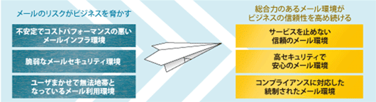 今や電子メールシステムはビジネスに不可欠なコミュニケーションの大動脈といえます。一方、メールの利用頻度、送信データ容量の増加にともない、社内・社外でのセキュリティの脅威も高まり、メール環境の課題はますます複雑・高度化し、メールのリスクがビジネスを脅かそうとしています。このような状況に対処するためには、サービスを止めない高信頼のメール環境、高セキュリティで安心のメール環境、そしてコンプライアンスに対応した統制されたメール環境といった総合力のあるメール環境つくりが重要となります。
