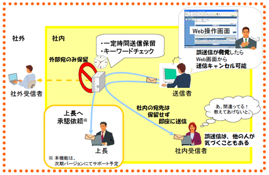 誤送信抑止サーバ上に保留されたメールが、上長の送信許可操作によってのみ、送信される機能です。