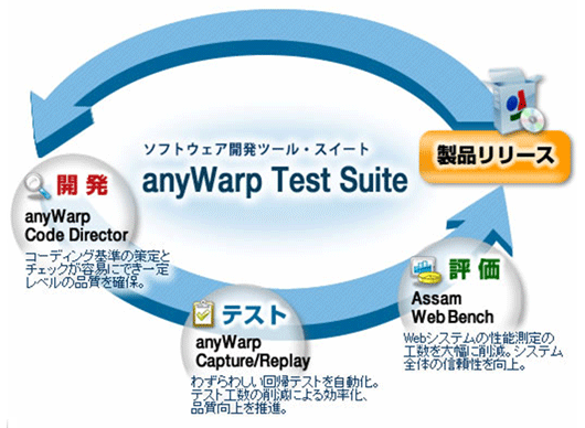 「anyWarp TestSuite」では、「anyWarp CodeDirector」でコーディング段階のテストにおける品質の維持とリスク低減を実現し、「Assam WebBench」で総合テストから運用段階での性能テストをカバーし、「anyWarp Capture/Replay」で回帰テストを支援します。このように本テストスイート製品は、テストの観点から開発工程全般をサポートできます。