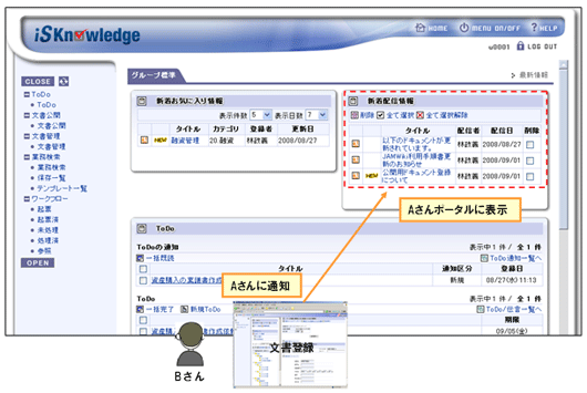 ・文書の登録または、更新と同時に周知させたい相手に通知することが可能です。通知された相手は、ポータル画面の新着情報として表示されます。