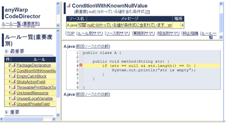 日立ソフト(本社:東京都品川区、執行役社長:小野 功)は、Java開発におけるコーディングルール違反をプロジェクト全体で組織的にチェックできる集中型Javaコード診断ツールを機能拡大した「anyWarp CodeDirector (エニーワープ・コードディレクター)V5.2」を2008年12月10日より発売します。今回の製品では、日立ソフトが社内で運用してきた実績や既存ユーザからの要望を元に、開発者が間違いやすくバグに直結しやすいコードを指摘できるように、新たに31のルールを追加しました。従来のルールに加え今回追加されたルールを適用することにより、品質の大幅な向上を図ることができます。