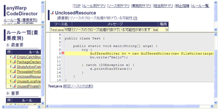 「anyWarp CodeDirector」は、日立ソフトが手がけた数多くの開発プロジェクトでの経験や既存ユーザからの要望に基づき、診断の準備、実施、結果の確認を省力化するための仕組みや、コード診断に用いるルールを充実してきています。今回の機能強化では、開発者が間違いやすくバグに直結しやすいコードを指摘するルールを拡充しました。例えば、条件式の結合ミス、リソースのクローズ漏れ、マルチスレッドに関する考慮漏れなどは、開発者のスキル不足あるいは不注意によりソースコードに紛れ込みやすい間違いと言えます。しかも、こうした間違いは致命的かつ比較的再現が難しいバグに直結することがほとんどです。こうした間違いを指摘するルールの充実により、より早い段階で重大なバグを摘出することができ、少ない作業で品質の安定したシステム構築が実現できます。