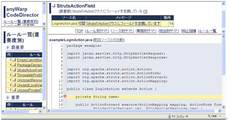 このルールでは、Struts のActionクラスを継承したクラスにおいて、インスタンスフィールドが宣言されているというように、マルチスレッドに関する考慮漏れがあることを指摘します。Actionクラスのインスタンスは、複数のスレッドにより共有されるオブジェクトであるため、こうしたインスタンスフィールドを持っていると、同時にアクセスされたHTTPリクエストによって値が共有されてしまい、例えば別人になりすませるなどの重大な問題が発生する可能性があります。また、このようなバグは単体テストでは発生せず再現性も低いので、早期に発見することが重要です。以下の例では、Actionクラスを継承したクラスの14行目にインスタンスフィールドが宣言されていることを指摘しています。
