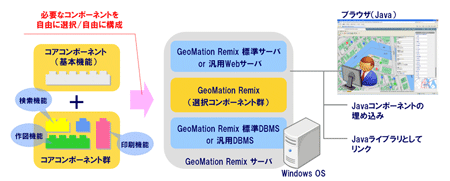 GeoMation Remixは、必要な機能だけを選択することが可能であり、またプログラミングをすることなく画面の改良などが可能なため、簡易に、低コストかつ短期間で、地理情報と連携した様々な業務システムを構築することができます。