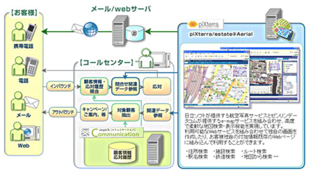 今回提供を開始する「CallFrontierX(コールフロンティア)」は、日立ソフトが保有するモバイル端末向けアプリケーション部品群で開発した携帯アプリと連携することにより、コールセンターからフィールド営業担当者に携帯メールを通じて問合せ案件を引き継ぎ、営業担当者は出張先から受持ち案件のチェックや作業完了報告を行うことができるようになります。また、日立ソフトの地図情報/航空写真配信サービス「piXterra(ピクステラ)」を「inspirX-C」と連携させることで、コールセンターのオペレーターが地図情報を活用した応対ができるようになります。例えば、問合せた顧客の住所に近い営業所の地図を送付したり、サービス提供エリアを地図で表示しながら応対することで、よりきめ細かい顧客対応が可能になります。