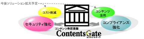 「ContentsGate」は、コンテンツの機密性、重要性、または保管先などの取り扱いをコンテンツ単位で管理者が承認し、認証情報を一元管理することをコンセプトに掲げたソフトウェアです。これら認証情報をもとに、コンテンツの取り扱い方法を自動的にチェックし、適切なコンテンツ管理を実現します。