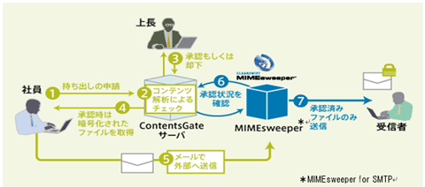 「ContentsGate」と「ContentsGate for Mail」は、コンテンツの持ち出し申請時に上長が承認し、承認された文書だけメールでの持ち出しを許可し、さらに、いつ、誰が、何を持ち出したかの履歴により、コンテンツの取扱い状況を把握します。なお、「ContentsGate for Mail」は、2008年11月14日に発表したクリアスウィフト株式会社(代表取締役社長:嘉規 邦伸)との共同開発によるもので、電子メールフィルタリング製品「MIMEsweeper for SMTP」との連携を実現しました。