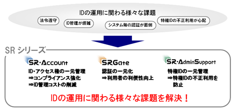 「SRシリーズ」では、複数システムのID・アクセス権の一元管理を実現する「SR-Account」、シングルサインオンを実現する「SRGate」、特権IDの一元管理を実現する「SR-AdminSupport」により、安全で信頼性が高い(Secure & Reliable)ID統合管理基盤を提供し、企業のID運用に関わる課題解決を目指しています。