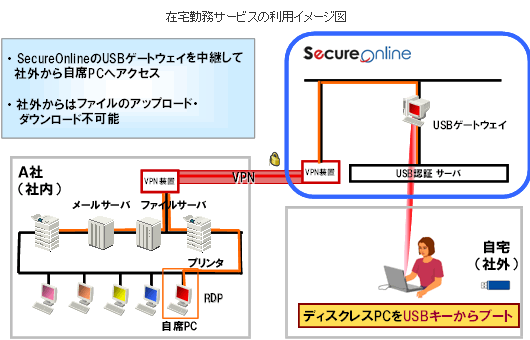 本サービスでは、USBキー1本をディスクレスPCに挿し込むだけで、お客様はインターネット回線を通じて社内の自席PCにアクセスできます。