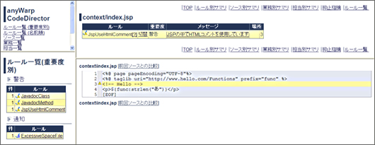 日立ソフト(本社:東京都品川区、執行役社長:小野 功)は、 Java 開発におけるコーディングルール違反をプロジェクト全体で組織的にチェックできる集中型Java コード診断ツールを機能拡大した 「anyWarp CodeDirector (エニーワープ・コードディレクター)V6.0」を2009 年6 月4 日より発売します。 今回の製品では、普及が進むJava EE 5(Servlet 2.5/JSP 2.1)への対応を行い、コード診断の適用範囲を拡大しました。 Java EE 5 の開発が普及しているオフショア開発の受け入れ時の更なる検収強化などで活用ができます。