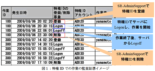 SR-AdminSupportが持つ特権IDの作業計画・特権IDの登録/削除履歴と、サーバでの特権IDのLogon/Logoffのログを取得(*4)、