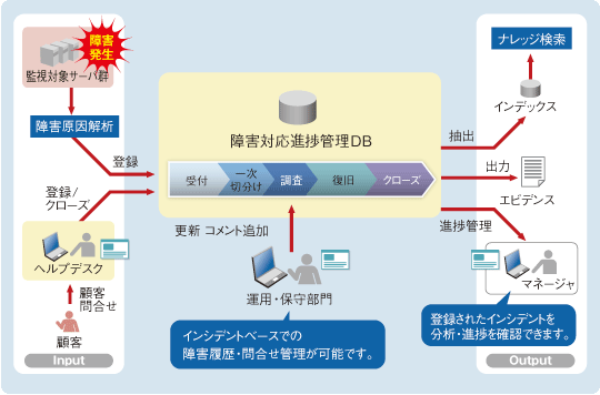 監視サーバからのイベント情報を取得し、「障害原因解析」「障害ナレッジ検索」「障害対応進捗管理」 の各機能を連携させて過去の障害情報から障害原因を類推し、IT障害原因究明時間の短縮を実現します。