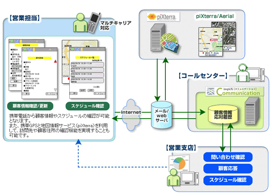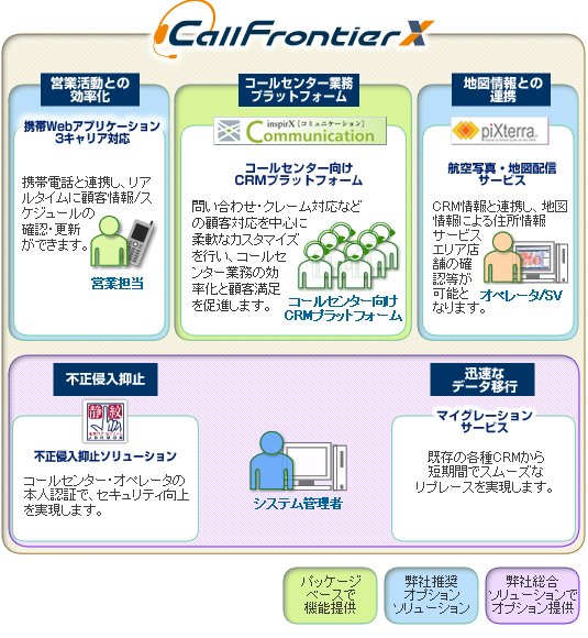 「CallFrontierX」は、コールセンターと外出している営業担当者やフィールド業務担当者が携帯電話で情報の受発信を行うことで、