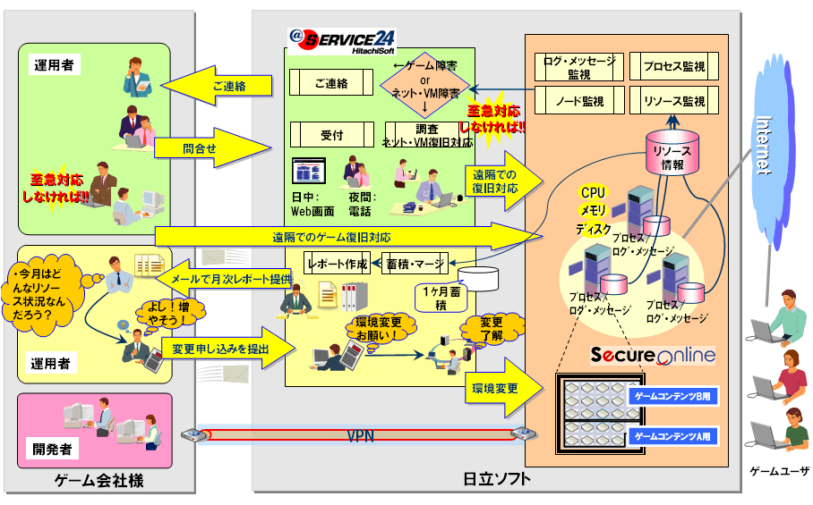 「Game Cloud Service」はこうしたオンラインゲーム会社が抱える課題を解決するサービスです。本サービスは、サーバ仮想マシン(VM) を月額で提供する、統制IT基盤提供サービス「SecureOnline(セキュアオンライン)」に、 ゲームユーザの推移やゲームライフサイクルの変動に応じてサーバリソース(CPU、メモリ、ディスク) を木目細かに増減させる判断を行えるようサーバリソースの推移を収集・蓄積する「運用基盤(監視)サービス」 と蓄積したサーバリソース情報を提供する「リソース適正化支援サービス」を付加しました。