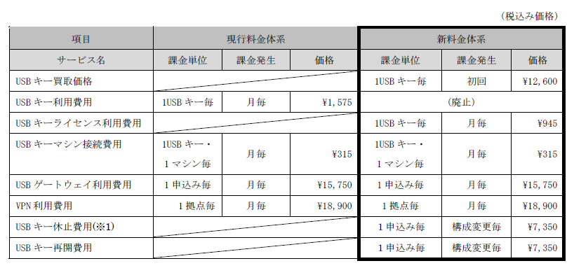 ・休止期間中はUSBキーライセンス利用費用とUSBキーマシン接続費用は不要ですが、USBゲートウェイ利用費用とVPN利用費用は必須です。