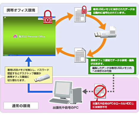 「秘文LE Personal Office」は、専用USBメモリで出張先や自宅を携帯オフィス環境に変える、 「社内データを社外に持ち出し、編集・参照したいが、情報の流出を簡単に防ぎたい」という要望に応える製品です。 本製品を使用していることを意識せずに携帯オフィス環境を実現できるのが特徴です。