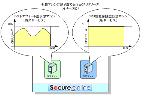 SecureOnlineでは、従来から仮想マシンに割り当てるCPUリソースを、ベストエフォート型で提供しています。ベストエフォート型では、
