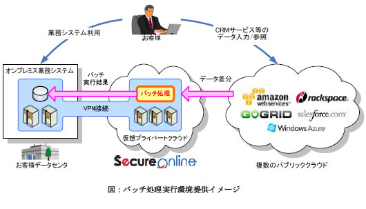 「SecureOnline」では、パブリッククラウド上に格納したデータを一旦SecureOnline上に取り込み、 バッチ実行環境で処理した結果をオンプレミスの業務システムに反映させることができます。 日立ソフトでは、これまでにもsalesforce.com上で営業員向け顧客情報提供サービスを構築し、salesforce.com内のデータを定期的に「SecureOnline」 上のバッチ実行環境に取り込み、バッチ処理実行後にオンプレミスのシステムに集計したデータを反映するシステムを構築・ 運用しているなどの実績があります。「SecureOnline」を中継して、データを取り込み、必要な処理を行った後で、業務システムに渡すことにより、 セキュアな環境下でバッチ処理を実行できます。