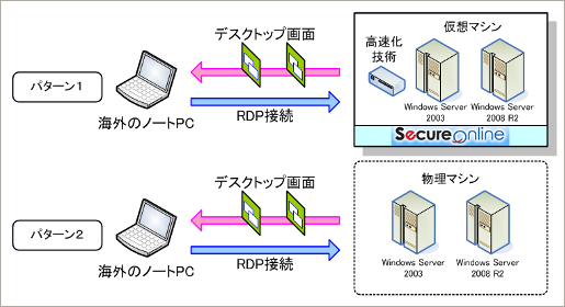 (リモートデスクトッププロトコル)を使用して、海外のPCから「SecureOnline」上の仮想マシン(Windows Server 2003 / Windows Server 2008 R2)