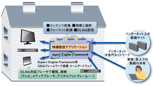 日立ソフトでは「SuperJ Engine Bundles」を提供開始し、その第一弾として、HGW 向け映像配信アプリケーションの提供を開始します。 本アプリケーションでは基本機能としてDLNA 機能であるDMC(*4)および DMS(*5)をHGW で実現でき、HGW から家庭内のDLNA 対応情報家電機器 (テレビ/メディアプレーヤ等のDMP(*6)、レコーダ/NAS 等のDMS)と連携した DLNA コンテンツの視聴を可能にします。また、映像配信の拡張機能として、インターネット等の動画サイトのデータをデジタルTV 等のDLNA プレーヤで視聴可能な形式に変換することで、通常のDLNA 機能では扱えないインターネット上のコンテンツが視聴可能になります。 本アプリケーションではコア機能のミドルウェアが提供されるため、本アプリケーション機能を活用した上位のアプリケーションを開発することにより、 より魅力的なシステム、サービスへの実現が可能となります。例えば、 オンライン上のセンターに保存されている動画や広告をデジタルフォトフレームに配信するデジタルサイネージシステムや、 インターネットを経由した遠隔地とのコンテンツ共有システムなどが実現可能です。