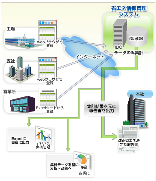 Webブラウザを利用したデータ登録や閲覧のほか、入出力帳票としてExcelシートが利用できます。これまでExcelでエネルギー使用データを管理していた事業者は、既存の帳票を変更することなく、システム上で改正省エネ法に関するデータを集計・分析することが可能です。お客様の業務形態にあわせた入力方式で、事業者全体のデータが一元管理できます。