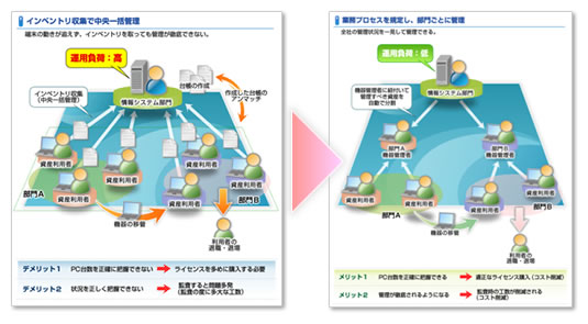 これらの課題を解決する為、日立ソフトの「クライアント管理サービス」では、情報資産の各管理業務について、 実質的なクライアントPC所有者である部門が管理するように業務プロセスを規定し、システムによって見える化することで、 管理省力化と管理徹底を実現しました。また、独自のソフトウェアカタログを作成してライセンス利用状況の見える化を実現しました。