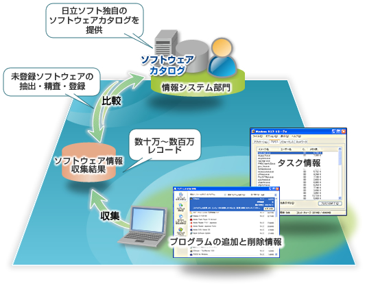 ・ 日立ソフト独自のソフトウェアカタログにより、精度の高いソフトウェア導入状況レポートが閲覧可能