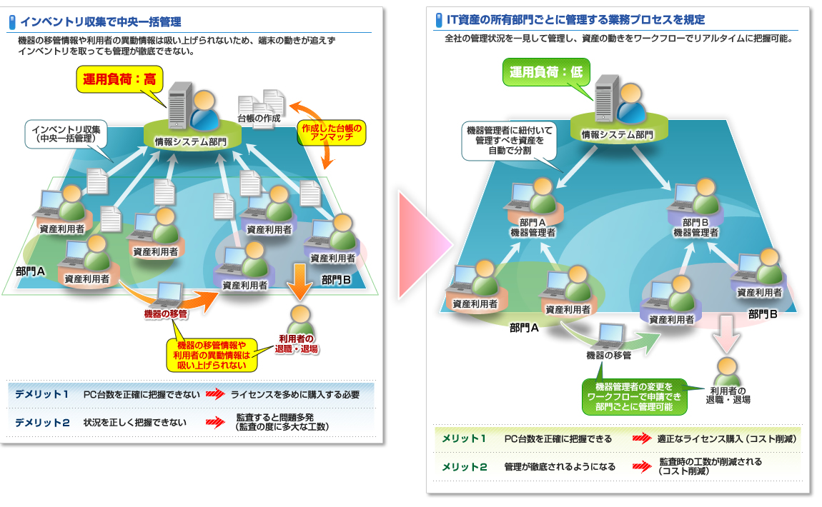 近年ではソフトウェアのライセンス違反を指摘される事例が増えており、各企業・ 団体にとってライセンス管理の徹底はコンプライアンス遵守の観点から非常に重要な経営課題にもなっています。しかしながら、 これまで多くの企業でIT資産管理が行われてきたにも関わらず、ライセンス管理や物品の管理に課題が出るのは、 以下のように大きく2つの原因があるためです。