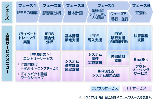 今回提供を開始するIFRS対応サービスでは、BBSの公認会計士のノウハウを活かしたコンサルティングサービスと日立ソフト、 日立システムの業務システム構築ノウハウに基づくITソリューションを融合し会計+ITの両面からワンストップで企業のIFRS対応を支援します。