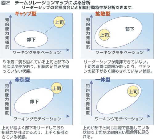 「リシテアCareer」は、人材を、効果的な投資と結果検証を続けることでその価値を高めることができる「人的資本(Human Capital)=人財」ととらえています。今回新しく組織パフォーマンス分析機能を追加したことにより、個人や組織単位に「知的能力発揮度」と「ワーキングモチベーション」を測定することができるようになりました。さらに「チームリレーションマップ」(図1)として可視化することにより、パフォーマンスネックの洗い出し、リーダーシップの発揮度合いと組織行動特性の分析(図2)が可能になり、上下間ギャップを捉え、個人や組織パフォーマンスを最大活用することができます。