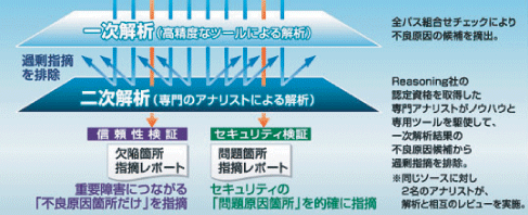 専用ソフトによる一次解析で不良原因箇所の候補を摘出後、専門のアナリストが二次解析で一次解析にて過剰に指摘した項目を排除することにより、開発者は二次解析で不良と認定された項目のみを修正すればよく、作業量が減少します。