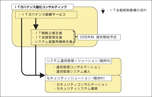 「ITガバナンス診断サービス」は、現存のソリューション体系「内部統制支援ソリューション」のうち、「ITガバナンス強化コンサルティング」の最初に提供するサービスに位置づけられています。(下図参照)