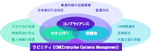 今回、販売を開始する「ラビ二ティ ECM」は、業務の中で作成・承認された文書を企業活動の記録として全社的に統合管理することで、これらの要件を満たすコンテンツ管理システムを構築できます。