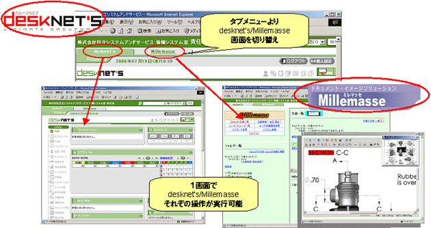 今回、販売を開始する「グループウェアソリューション」は、Webベースのグループウェアとして、使いやすさを追求し、160万人以上のユーザに支持されているネオジャパンの「desknet's」と、大量の文書や画像を統括的に保管できファイル毎のセキュリティや監査証拠の機能をもつ日立システムの「Millemasse」との連携により、両製品の特性を生かしたシステムを構築します。