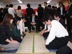 「セキュリティかるた大会」は、畳を敷き紅白幕を張って和風にしつらえた会場で、3人1組で対戦する部署対抗の団体戦と、個人戦の2種類をトーナメント形式で実施しました。合計48人の営業やシステムエンジニアが参加し、会場いっぱいの見学者が見守る中、大盛況のうちに終了しました。 事前にカルタを読み込み、練習を積んで参戦する社員も多く見られ、今回は団体戦・個人戦ともにシステムエンジニア部門が優勝しました。