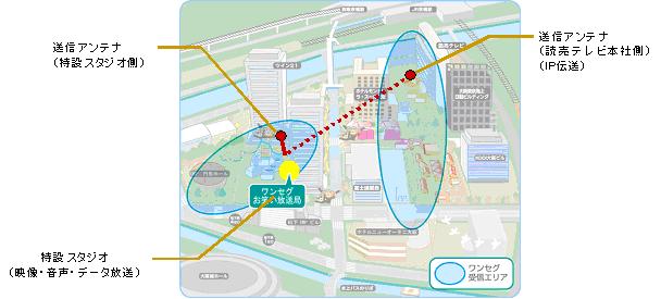 本実証実験の実施にあたり、読売テレビは本実証実験の企画およびワンセグ放送の番組制作、携帯サイトでの動画配信を行います。NTTドコモは、本実証実験の企画協力のほか、各会場でのワンセグ放送の展開において、タッチ&トライ環境の整備や容易なチャンネル設定方法の提供により、ワンセグ放送の認知向上および視聴促進を図ります。日立、日立システム、日立国際電気は、各会場でのワンセグ実験局設置にあたって、ワンセグ放送機器、リアルタイムデータ放送送出などのワンセグ放送システムを提供します。特に、わくわく宝島会場においては、複雑な都市空間でのエリア確保のため、IPネットワーク経由でワンセグ・コンテンツを伝送する新しいアンテナ分岐・拡張方式を導入します。本会場は高層ビルが立ち並び、1つのアンテナで電波伝搬を実現することは困難ですが、IPネットワークを利用しコンテンツ配信を行うことで、2箇所のエリア同時の放送を実現します。
