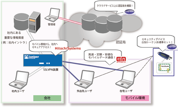 「Secure Accessプラス」は、日立システムの「ネットワークセキュリティソリューション」で提供しているジュニパーネットワークス社のSSL-VPN装置「Secure Access700」シリーズと、ペンティオの認証局パッケージ製品「PentioプライベートCA Gleas(グレアス)」、およびクライアント証明書を格納する認証用USBトークン「Pentio PKI USB token 1800」をパッケージングし、より高いセキュリティと利便性を同時に実現するリモートアクセスソリューションです。