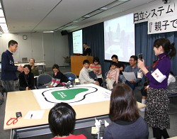 日立システムでは、これまで学生にITソリューションの仕事を疑似体験させ、正しい職種理解を促す「SE大學」や、新入社員教育の中のロボットを動かすプログラミング教育など、ITに関するユニークな教育を行ってきました。この度、これらの過程で培ったさまざまなノウハウを基に一般用学習教材として開発し、プログラミングの成果をレゴ社のロボット教材「教育用レゴ マインドストーム」で動かすというITを体験する教室を開催し、14組(総計45人)の当社社員の親子が参加しました。