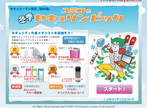 2月2日の情報セキュリティの日にちなみ、本年9月に開設5周年を迎える「情報セキュリティブログ」のコンテンツの一つとして、楽しみながら情報セキュリティを学ぶことができるセキュリーマン検定番外編「ユミコの冬季セキュリンピック」を2月2日から公開します。