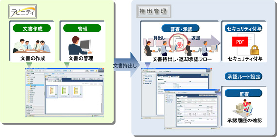 「ラビニティ」に保管されている文書を外部に持出す際に、あらかじめ設定した承認ルートを経て持出しを行うことができます。また、文書持出し時や返却時の属性情報と、持出しから返却までの案件の申請・審査・承認・却下・引戻しの操作による案件の状態及び履歴を管理します。