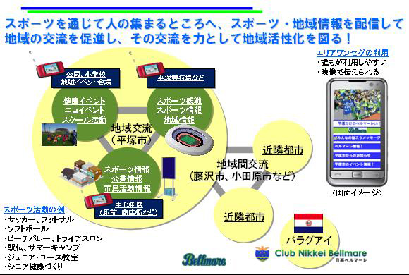「スポーツ交流を生かした地域活性化」を、エリアワンセグなどを活用した地域メディアで実現することを計画しています。総合型スポーツクラブという湘南ベルマーレの特徴を生かし、サッカーだけでなくビーチバレーやフットサル、トライアスロン、ソフトボールなどのスポーツコンテンツも活用、さらに地域情報も加えた地域メディアを構築し、それに伴う、新しい人や情報の交流が生まれ、地域活性化につながることを期待します。今回の実験は、フェーズ1として、まずは平塚競技場でのエリアワンセグを開始します。