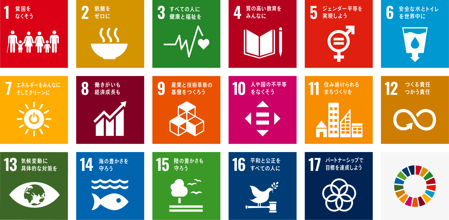 SDGs(Sustainable Development Goals:持続可能な開発目標)は、「誰一人取り残さない(leave no one behind)」持続可能でより良い社会の実現をめざす世界共通の目標です。2015年9月に開催された「国連持続可能な開発サミット」において、150以上のすべての加盟国が合意した「持続可能な開発のための2030アジェンダ」の中で掲げられました。このアジェンダでは、2030年までに達成すべき目標としてとして、貧困や不平等、不公正の撲滅、気候変動への対応など17のゴールと169のターゲットを定めています。