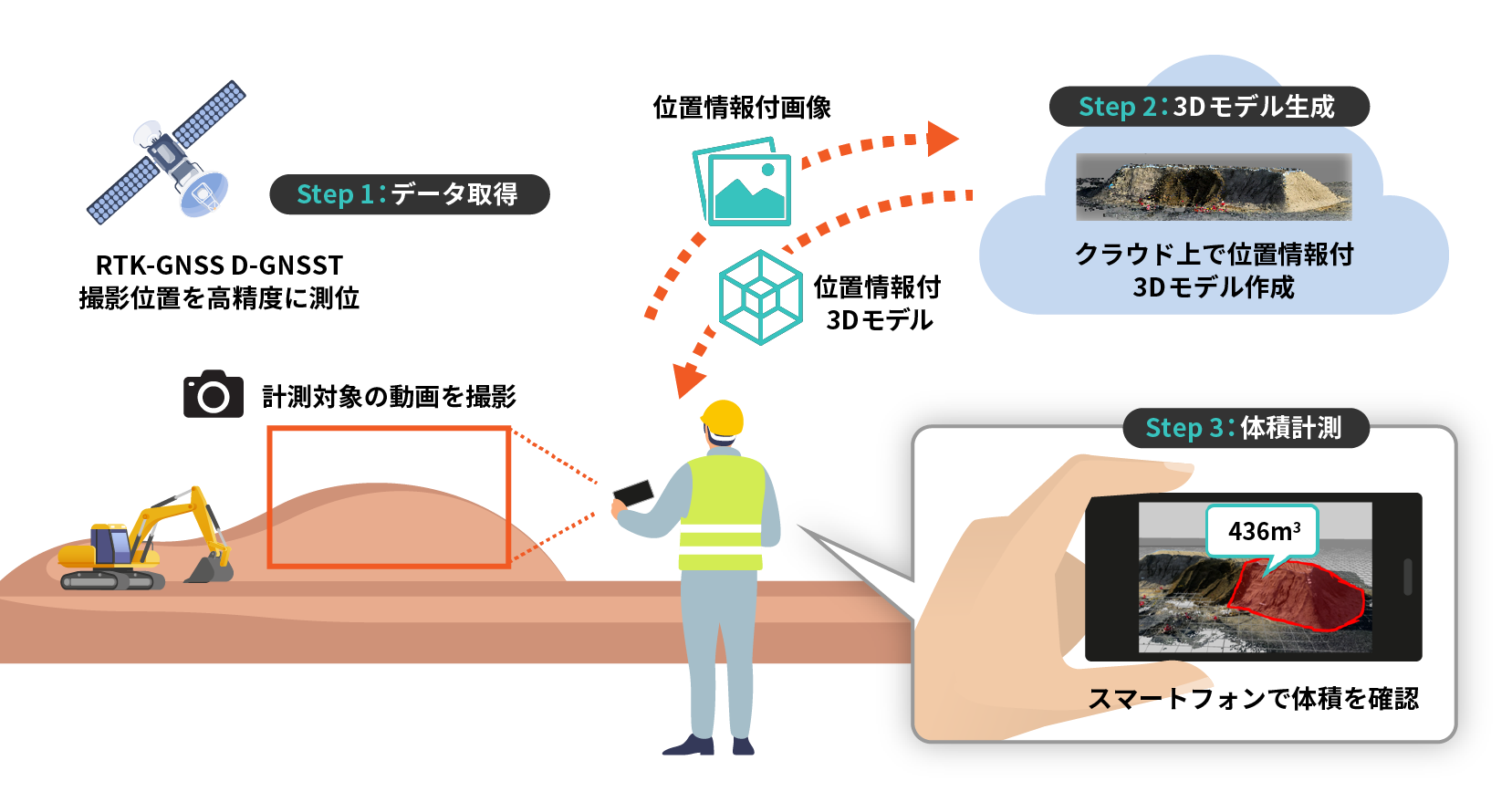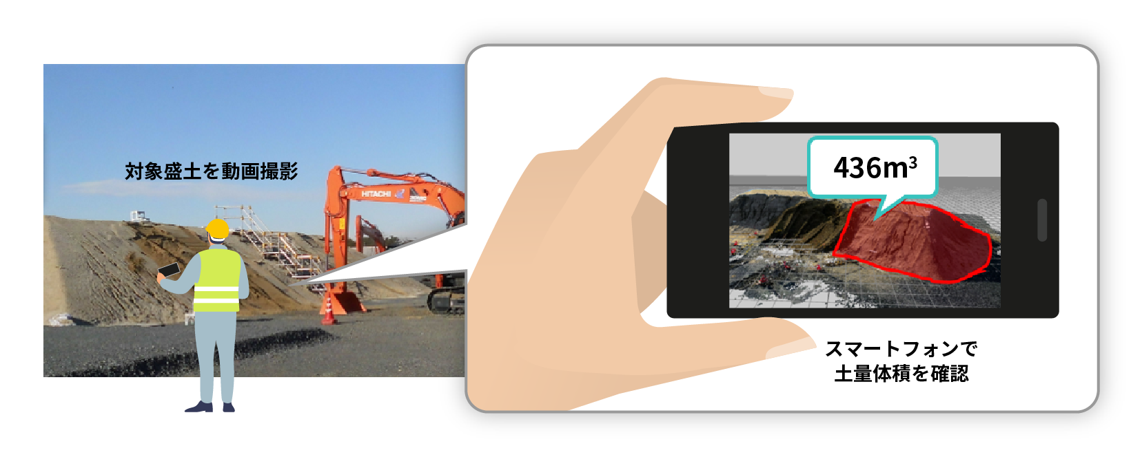 スマートフォンで動画撮影することで、盛土の体積を簡単計測。手軽な土量計測で、日々の施工の進捗を簡単に管理。