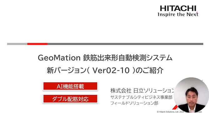 GeoMation 鉄筋出来形自動検測システムは、新バージョンで画像認識プロセスにAIを採用し、鉄筋を二段に組んだダブル配筋の計測や、逆光での計測に対応できるようになりました。この動画では、GeoMation 鉄筋出来形自動検測システムの新バージョンについて紹介します。