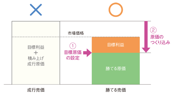 「CostProducer」は、製品の販売予定数と製品価値に基づいて予定販売価格を定めた上で、販売価格から目標利益を差し引いて目標原価を算出します。さらに、目標原価を達成するため、現場の収益改善活動に落とし込むコストマネジメント手法をPDCAサイクルで実践することができます。