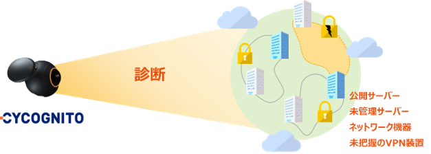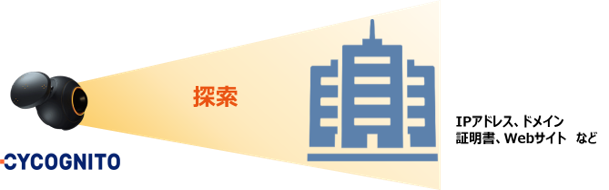 CyCognitoは、攻撃者視点で企業のグローバルIPアドレスやドメイン情報、証明書などの情報を探索、さらにその先にあるグローバルIPアドレスを有するサーバーや機器、WebアプリケーションなどのIT資産を探索し、検出します。