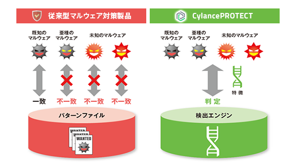 パターンマッチング型のマルウェア対策製品は、新種のマルウェアが登場してからパターンファイルが作成・適用されるまでにタイムラグがあり、その間にマルウェアに感染してしまう危険性がありました。