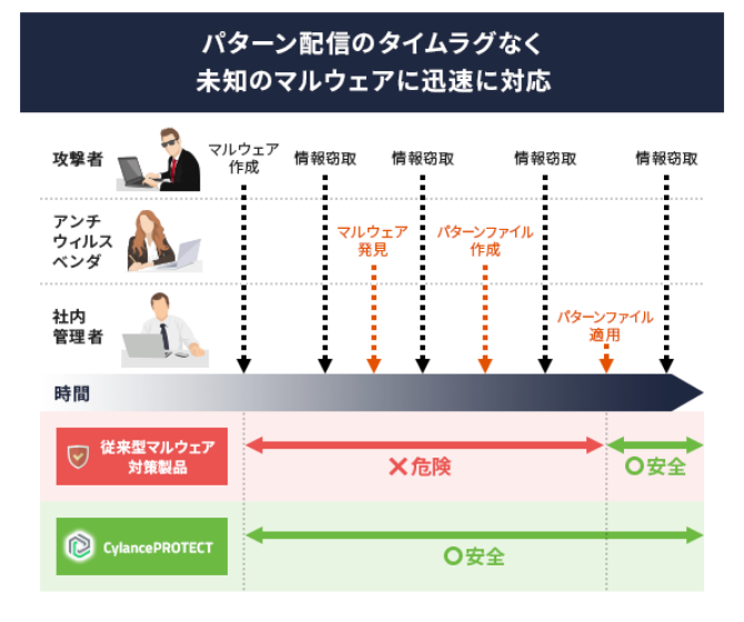 従来のマルウェア対策製品が、新種のマルウェアを防御できなかった場合、製品ベンダがパターンファイルを作成後にPC側で適用されるまでは、新種のマルウェアへの感染リスクが高い危険な状態となります。