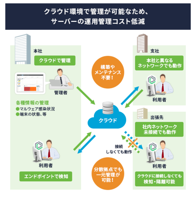 従来のパターンマッチング型のマルウェア対策製品の場合、オンプレミスに管理サーバーを用意する必要がありました。CylancePROTECTはクラウド上に管理コンソールが用意されているため、管理サーバーの構築や維持・管理の必要もなく、運用コストを低減させることができます。